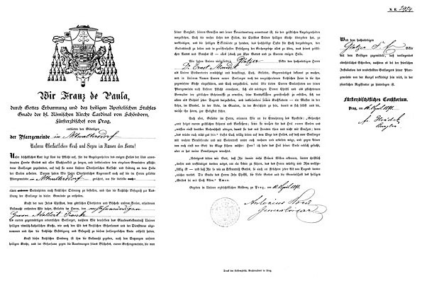 Im Auftrage des Hochwürdigen Herrn Großdechanten, welcher aus Anlaß der morgen in Neugersdorf stattfindenden Installation des Herrn Pfarrer May heut von hier abgereist ist, beehre ich mich Euer Hochwürden ganz ergebenst mitzutheilen, daß, nachdem am heutigen Tage Ihre Bestätigung als Pfarrer aus Prag eingetroffen ist, Se. Hochwürden beabsichtigen, nächsten Donnerstag (16.) Nachmittag hierselbst Ihre Investitur vorzunehmen.